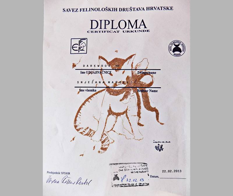 Our “Darkwood” cattery is registered with FIFe (Fédération Internationale Féline) from 22.02.2013.